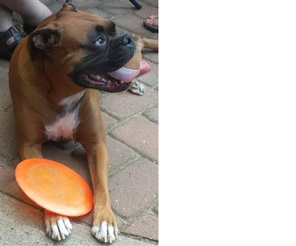 Our 4 year old boxer Lucky is an entertaining, energetic, and loving addition to our family. His favorite thing to do is fetch his frisbee.