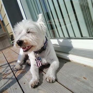 Gus is a 12 year old westie that loves working on his tan in the summer he spends all day laying on the deck |